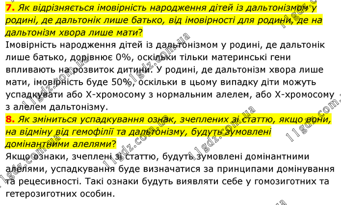 7. Як відрізняється імовірність народження дітей із дальтонізмом у родині, де дальтонік лише батько, від імовірності для родини, де на дальтонізм хвора лише мати? Імовірність народження дітей із дальтонізмом у родині, де дальтонік лише батько, дорівнює 0%, оскільки тільки материнські гени впливають на розвиток дитини. У родині, де дальтонізм хвора лише мати, імовірність буде 50%, оскільки в цьому випадку діти можуть успадкувати або X-хромосому з нормальним алелем, або X-хромосому з алелем дальтонізму. 8. Як зміниться успадкування ознак, зчеплених зі статтю, якщо вони, на відміну від гемофілії та дальтонізму, будуть зумовлені домінантними алелями? Якщо ознаки, зчеплені зі статтю, будуть зумовлені домінантними алелями, успадкування буде визначатися за принципами домінування та рецесивності. Такі ознаки будуть виявляти себе у гомозиготних та гетерозиготних особин.