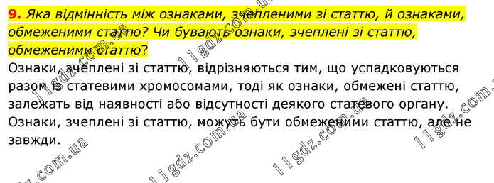 Яка відмінність між ознаками, зчепленими зі статтю, й ознаками, обмеженими статтю? Чи бувають ознаки, зчеплені зі статтю, обмеженими статтю? Ознаки, зчеплені зі статтю, відрізняються тим, що успадковуються разом із статевими хромосомами, тоді як ознаки, обмежені статтю, залежать від наявності або відсутності деякого статевого органу. Ознаки, зчеплені зі статтю, можуть бути обмеженими статтю, але не завжди.