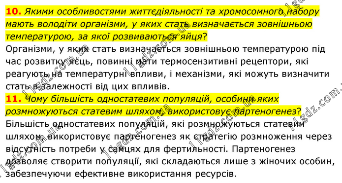 10. Якими особливостями життєдіяльності та хромосомного набору мають володіти організми, у яких стать визначається зовнішньою температурою, за якої розвиваються яйця? Організми, у яких стать визначається зовнішньою температурою під час розвитку яєць, повинні мати термосензитивні рецептори, які реагують на температурні впливи, і механізми, які можуть визначити стать в залежності від цих впливів. 11. Чому більшість одностатевих популяцій, особини яких розмножуються статевим шляхом, використовує партеногенез? Більшість одностатевих популяцій, які розмножуються статевим шляхом, використовує партеногенез як стратегію розмноження через відсутність потреби у самцях для фертильності. Партеногенез дозволяє створити популяції, які складаються лише з жіночих особин, забезпечуючи ефективне використання ресурсів.