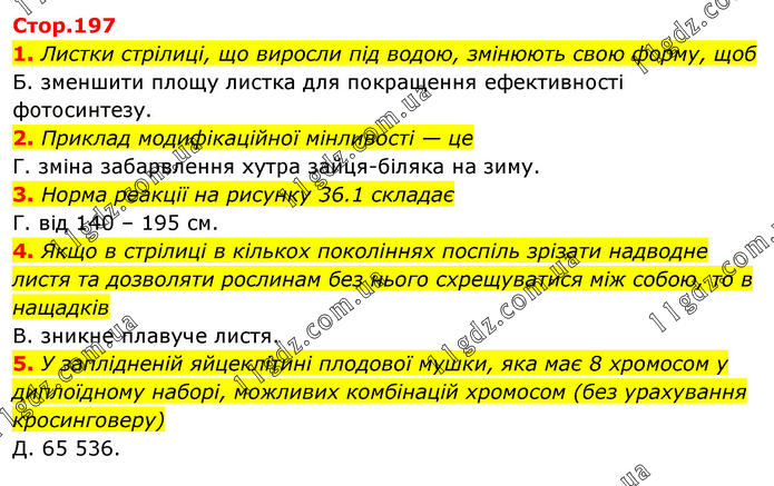 1. Листки стрілиці, що виросли під водою, змінюють свою форму, щоб Б. зменшити площу листка для покращення ефективності фотосинтезу. 2. Приклад модифікаційної мінливості — це Г. зміна забарвлення хутра зайця-біляка на зиму. 3. Норма реакції на рисунку 36.1 складає Г. від 140 – 195 см. 4. Якщо в стрілиці в кількох поколіннях поспіль зрізати надводне листя та дозволяти рослинам без нього схрещуватися між собою, то в нащадків В. зникне плавуче листя. 5. У заплідненій яйцеклітині плодової мушки, яка має 8 хромосом у диплоїдному наборі, можливих комбінацій хромосом (без урахування кросинговеру) Д. 65 536.
