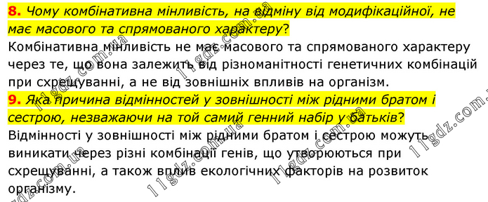 8. Чому комбінативна мінливість, на відміну від модифікаційної, не має масового та спрямованого характеру? Комбінативна мінливість не має масового та спрямованого характеру через те, що вона залежить від різноманітності генетичних комбінацій при схрещуванні, а не від зовнішніх впливів на організм. 9. Яка причина відмінностей у зовнішності між рідними братом і сестрою, незважаючи на той самий генний набір у батьків? Відмінності у зовнішності між рідними братом і сестрою можуть виникати через різні комбінації генів, що утворюються при схрещуванні, а також вплив екологічних факторів на розвиток організму.