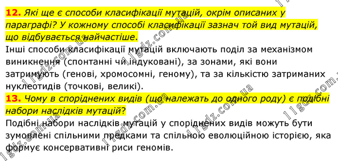 12. Які ще є способи класифікації мутацій, окрім описаних у параграфі? У кожному способі класифікації зазнач той вид мутацій, що відбувається найчастіше. Інші способи класифікації мутацій включають поділ за механізмом виникнення (спонтанні чи індуковані), за зонами, які вони затримують (генові, хромосомні, геному), та за кількістю затриманих нуклеотидів (точкові, великі). 13. Чому в споріднених видів (що належать до одного роду) є подібні набори наслідків мутацій? Подібні набори наслідків мутацій у споріднених видів можуть бути зумовлені спільними предками та спільною еволюційною історією, яка формує консервативні риси геномів.