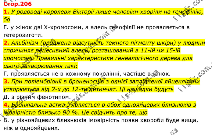 1. У родоводі королеви Вікторії лише чоловіки хворіли на гемофілію, бо Г. у жінок дві Х-хромосоми, а алель гемофілії не проявляється в гетерозиготи. 2. Альбінізм (вроджена відсутність темного пігменту шкіри) у людини спричиняє рецесивний алель, розташований в 11-ій чи 15-ій хромосомі. Правильні характеристики генеалогічного дерева для цього захворювання такі: Г. проявляється не в кожному поколінні, частіше в жінок. 3. При поліембріонії в броненосців з однієї заплідненої яйцеклітини утворюється від 2-х до 12-ти дитинчат. Ці нащадки будуть Д. з різним фенотипом. 4. Бронхіальна астма з’являється в обох однояйцевих близнюків з імовірністю близько 90 %. Це свідчить про те, що В. у різнояйцевих близнюків імовірність появи хвороби буде вища, ніж в однояйцевих.