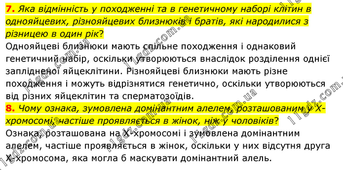 7. Яка відмінність у походженні та в генетичному наборі клітин в однояйцевих, різнояйцевих близнюків і братів, які народилися з різницею в один рік? Однояйцеві близнюки мають спільне походження і однаковий генетичний набір, оскільки утворюються внаслідок розділення однієї заплідненої яйцеклітини. Різнояйцеві близнюки мають різне походження і можуть відрізнятися генетично, оскільки утворюються від різних яйцеклітин та сперматозоїдів. 8. Чому ознака, зумовлена домінантним алелем, розташованим у Х-хромосомі, частіше проявляється в жінок, ніж у чоловіків? Ознака, розташована на Х-хромосомі і зумовлена домінантним алелем, частіше проявляється в жінок, оскільки у них відсутня друга Х-хромосома, яка могла б маскувати домінантний алель.