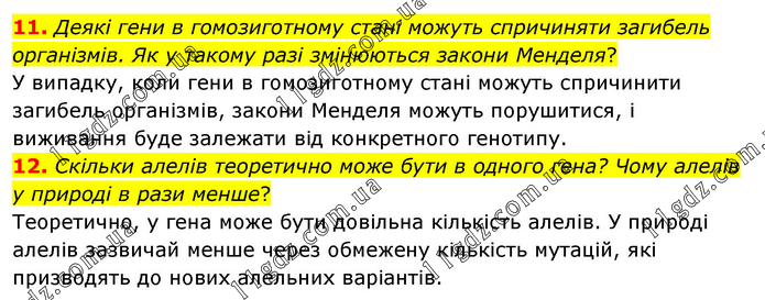 11. Деякі гени в гомозиготному стані можуть спричиняти загибель організмів. Як у такому разі змінюються закони Менделя? У випадку, коли гени в гомозиготному стані можуть спричинити загибель організмів, закони Менделя можуть порушитися, і виживання буде залежати від конкретного генотипу. 12. Скільки алелів теоретично може бути в одного гена? Чому алелів у природі в рази менше? Теоретично, у гена може бути довільна кількість алелів. У природі алелів зазвичай менше через обмежену кількість мутацій, які призводять до нових алельних варіантів.