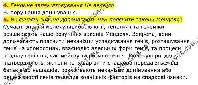 4. Геномне запам’ятовування Не веде до В. порушення домінування. 5. Як сучасні знання допомагають нам пояснити закони Менделя? Сучасні знання молекулярної біології, генетики та геноміки розширюють наше розуміння законів Менделя. Зокрема, вони допомагають пояснити механізми успадкування генів, розташування генів на хромосомах, взаємодію алельних форм генів, та процеси розділу генів під час мейозу та розмноження. Молекулярні дані підтверджують, як гени та їх варіанти спадково передаються від батьків до нащадків, розкривають механізми домінування або рецесивності генів та вплив зовнішніх факторів на спадкові ознаки.