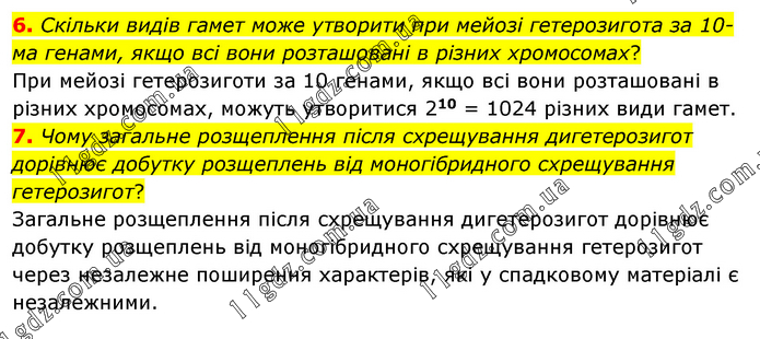 6. Скільки видів гамет може утворити при мейозі гетерозигота за 10-ма генами, якщо всі вони розташовані в різних хромосомах? При мейозі гетерозиготи за 10 генами, якщо всі вони розташовані в різних хромосомах, можуть утворитися 210 = 1024 різних види гамет. 7. Чому загальне розщеплення після схрещування дигетерозигот дорівнює добутку розщеплень від моногібридного схрещування гетерозигот? Загальне розщеплення після схрещування дигетерозигот дорівнює добутку розщеплень від моногібридного схрещування гетерозигот через незалежне поширення характерів, які у спадковому матеріалі є незалежними.