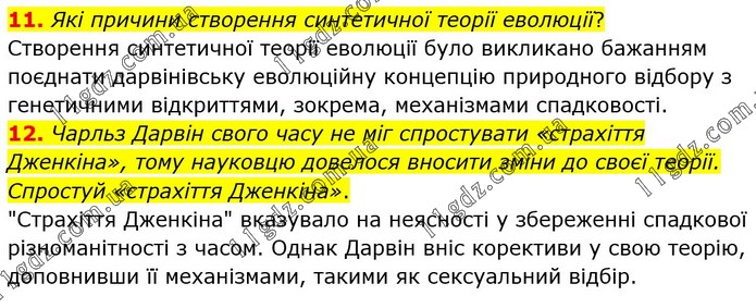 11. Які причини створення синтетичної теорії еволюції? Створення синтетичної теорії еволюції було викликано бажанням поєднати дарвінівську еволюційну концепцію природного відбору з генетичними відкриттями, зокрема, механізмами спадковості. 12. Чарльз Дарвін свого часу не міг спростувати «страхіття Дженкіна», тому науковцю довелося вносити зміни до своєї теорії. Спростуй «страхіття Дженкіна». "Страхіття Дженкіна" вказувало на неясності у збереженні спадкової різноманітності з часом. Однак Дарвін вніс корективи у свою теорію, доповнивши її механізмами, такими як сексуальний відбір.