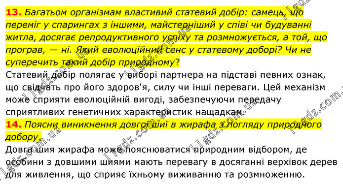 13. Багатьом організмам властивий статевий добір: самець, що переміг у спарингах з іншими, майстерніший у співі чи будуванні житла, досягає репродуктивного успіху та розмножується, а той, що програв, — ні. Який еволюційний сенс у статевому доборі? Чи не суперечить такий добір природному? Статевий добір полягає у виборі партнера на підставі певних ознак, що свідчать про його здоров'я, силу чи інші переваги. Цей механізм може сприяти еволюційній вигоді, забезпечуючи передачу сприятливих генетичних характеристик нащадкам. 14. Поясни виникнення довгої шиї в жирафа з погляду природного добору. Довга шия жирафа може пояснюватися природним відбором, де особини з довшими шиями мають перевагу в досяганні верхівок дерев для живлення, що сприяє їхньому виживанню та розмноженню.