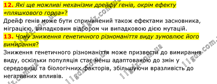 12. Які ще можливі механізми дрейфу генів, окрім ефекту «пляшкового горла»? Дрейф генів може бути спричинений також ефектами засновника, міграцією, випадковим відбором чи випадковою дією мутацій. 13. Чому зниження генетичного різноманіття виду зумовлює його вимирання? Зниження генетичного різноманіття може призвести до вимирання виду, оскільки популяція стає менш адаптованою до змін у середовищі та біологічних факторів, збільшуючи вразливість до негативних впливів.