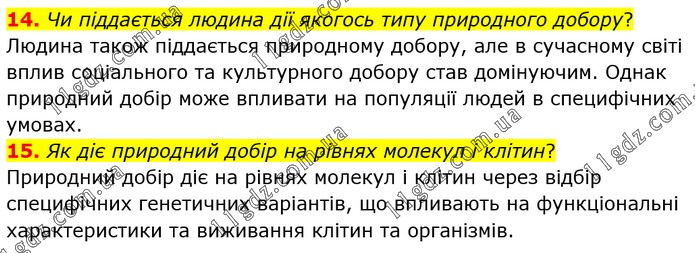 14. Чи піддається людина дії якогось типу природного добору? Людина також піддається природному добору, але в сучасному світі вплив соціального та культурного добору став домінуючим. Однак природний добір може впливати на популяції людей в специфічних умовах. 15. Як діє природний добір на рівнях молекул і клітин? Природний добір діє на рівнях молекул і клітин через відбір специфічних генетичних варіантів, що впливають на функціональні характеристики та виживання клітин та організмів.