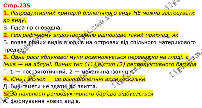 1. Репродуктивний критерій біологічного виду НЕ можна застосувати до виду. В. Гідра прісноводна. 2. Географічному видоутворенню відповідає такий приклад, як Б. поява різних видів в’юрків на островах від спільного материкового предка. 3. Одна раса яблуневої мухи розмножується переважно на глоді, а інша — на яблуні. Виник тип (1) і підтип (2) репродуктивного бар’єра Г. 1 — постзиготичний, 2 — механічна ізоляція. 4. Кінь і віслюк — це різні біологічні види, оскільки Д. їхні гамети не здатні до злиття. 5. За наявності репродуктивного бар’єра відбувається А. формування нових видів.