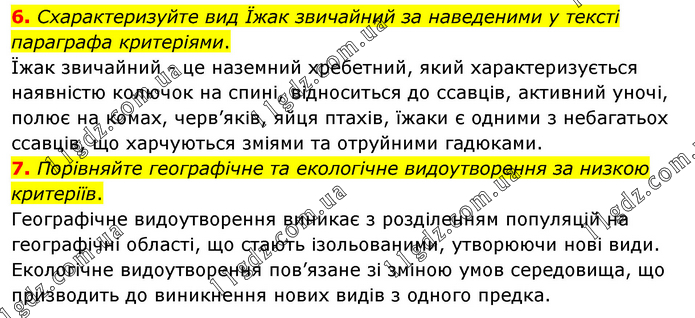 6. Схарактеризуйте вид Їжак звичайний за наведеними у тексті параграфа критеріями. Їжак звичайний - це наземний хребетний, який характеризується наявністю колючок на спині, відноситься до ссавців, активний уночі, полює на комах, черв’яків, яйця птахів, їжаки є одними з небагатьох ссавців, що харчуються зміями та отруйними гадюками. 7. Порівняйте географічне та екологічне видоутворення за низкою критеріїв. Географічне видоутворення виникає з розділенням популяцій на географічні області, що стають ізольованими, утворюючи нові види. Екологічне видоутворення пов’язане зі зміною умов середовища, що призводить до виникнення нових видів з одного предка.