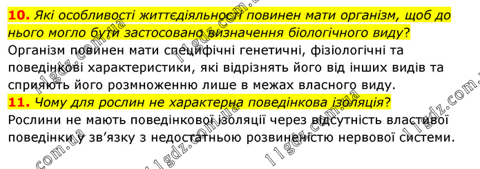 10. Які особливості життєдіяльності повинен мати організм, щоб до нього могло бути застосовано визначення біологічного виду? Організм повинен мати специфічні генетичні, фізіологічні та поведінкові характеристики, які відрізнять його від інших видів та сприяють його розмноженню лише в межах власного виду. 11. Чому для рослин не характерна поведінкова ізоляція? Рослини не мають поведінкової ізоляції через відсутність властивої поведінки у зв’язку з недостатньою розвиненістю нервової системи.