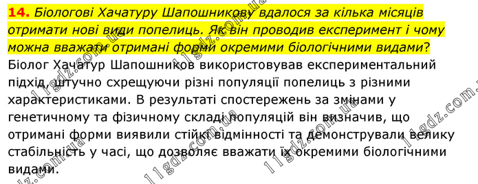 Біологові Хачатуру Шапошникову вдалося за кілька місяців отримати нові види попелиць. Як він проводив експеримент і чому можна вважати отримані форми окремими біологічними видами? Біолог Хачатур Шапошников використовував експериментальний підхід, штучно схрещуючи різні популяції попелиць з різними характеристиками. В результаті спостережень за змінами у генетичному та фізичному складі популяцій він визначив, що отримані форми виявили стійкі відмінності та демонстрували велику стабільність у часі, що дозволяє вважати їх окремими біологічними видами.