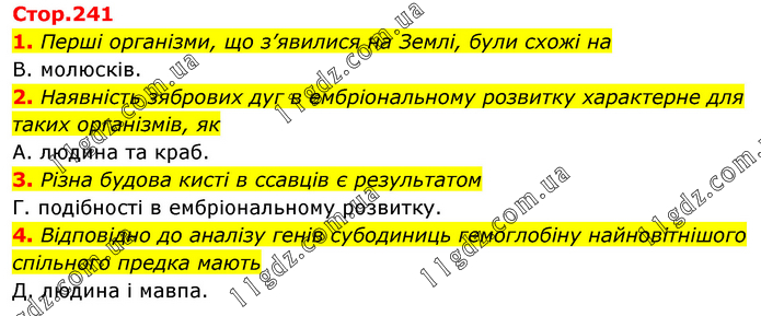 1. Перші організми, що з’явилися на Землі, були схожі на В. молюсків. 2. Наявність зябрових дуг в ембріональному розвитку характерне для таких організмів, як А. людина та краб. 3. Різна будова кисті в ссавців є результатом Г. подібності в ембріональному розвитку. 4. Відповідно до аналізу генів субодиниць гемоглобіну найновітнішого спільного предка мають Д. людина і мавпа.