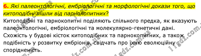 Які палеонтологічні, ембріологічні та морфологічні докази того, що китоподібні пішли від парнокопитних? Китоподібні та парнокопитні поділяють спільного предка, як вказують палеонтологічні, ембріологічні та молекулярно-генетичні дані. Схожість у будові кісток китоподібних та парнокопитних, а також подібність у розвитку ембріонів, свідчать про їхню еволюційну спорідненість.