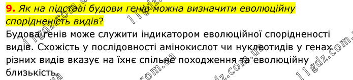 Як на підставі будови генів можна визначити еволюційну спорідненість видів? Будова генів може служити індикатором еволюційної спорідненості видів. Схожість у послідовності амінокислот чи нуклеотидів у генах різних видів вказує на їхнє спільне походження та еволюційну близькість.