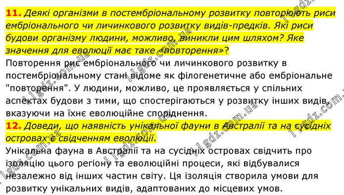 11. Деякі організми в постембріональному розвитку повторюють риси ембріонального чи личинкового розвитку видів-предків. Які риси будови організму людини, можливо, виникли цим шляхом? Яке значення для еволюції має таке «повторення»? Повторення рис ембріонального чи личинкового розвитку в постембріональному стані відоме як філогенетичне або ембріональне "повторення". У людини, можливо, це проявляється у спільних аспектах будови з тими, що спостерігаються у розвитку інших видів, вказуючи на їхнє еволюційне споріднення. 12. Доведи, що наявність унікальної фауни в Австралії та на сусідніх островах є свідченням еволюції. Унікальна фауна в Австралії та на сусідніх островах свідчить про ізоляцію цього регіону та еволюційні процеси, які відбувалися незалежно від інших частин світу. Ця ізоляція створила умови для розвитку унікальних видів, адаптованих до місцевих умов.