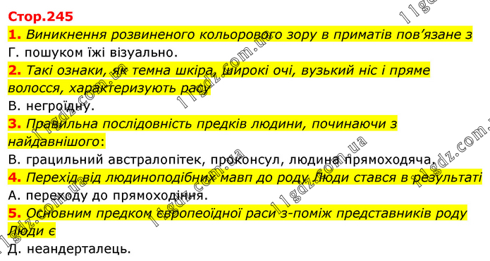 1. Виникнення розвиненого кольорового зору в приматів пов’язане з Г. пошуком їжі візуально. 2. Такі ознаки, як темна шкіра, широкі очі, вузький ніс і пряме волосся, характеризують расу В. негроїдну. 3. Правильна послідовність предків людини, починаючи з найдавнішого: В. грацильний австралопітек, проконсул, людина прямоходяча. 4. Перехід від людиноподібних мавп до роду Люди стався в результаті А. переходу до прямоходіння. 5. Основним предком європеоїдної раси з-поміж представників роду Люди є Д. неандерталець.