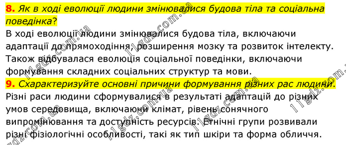 8. Як в ході еволюції людини змінювалися будова тіла та соціальна поведінка? В ході еволюції людини змінювалися будова тіла, включаючи адаптації до прямоходіння, розширення мозку та розвиток інтелекту. Також відбувалася еволюція соціальної поведінки, включаючи формування складних соціальних структур та мови. 9. Схарактеризуйте основні причини формування різних рас людини. Різні раси людини сформувалися в результаті адаптацій до різних умов середовища, включаючи клімат, рівень сонячного випромінювання та доступність ресурсів. Етнічні групи розвивали різні фізіологічні особливості, такі як тип шкіри та форма обличчя.