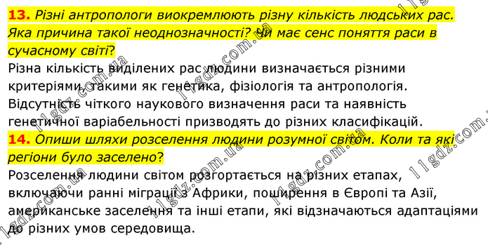 13. Різні антропологи виокремлюють різну кількість людських рас. Яка причина такої неоднозначності? Чи має сенс поняття раси в сучасному світі? Різна кількість виділених рас людини визначається різними критеріями, такими як генетика, фізіологія та антропологія. Відсутність чіткого наукового визначення раси та наявність генетичної варіабельності призводять до різних класифікацій. 14. Опиши шляхи розселення людини розумної світом. Коли та які регіони було заселено? Розселення людини світом розгортається на різних етапах, включаючи ранні міграції з Африки, поширення в Європі та Азії, американське заселення та інші етапи, які відзначаються адаптаціями до різних умов середовища.
