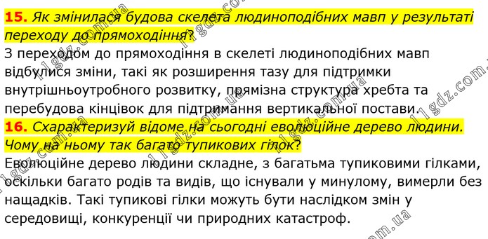 15. Як змінилася будова скелета людиноподібних мавп у результаті переходу до прямоходіння? З переходом до прямоходіння в скелеті людиноподібних мавп відбулися зміни, такі як розширення тазу для підтримки внутрішньоутробного розвитку, прямізна структура хребта та перебудова кінцівок для підтримання вертикальної постави. 16. Схарактеризуй відоме на сьогодні еволюційне дерево людини. Чому на ньому так багато тупикових гілок? Еволюційне дерево людини складне, з багатьма тупиковими гілками, оскільки багато родів та видів, що існували у минулому, вимерли без нащадків. Такі тупикові гілки можуть бути наслідком змін у середовищі, конкуренції чи природних катастроф.