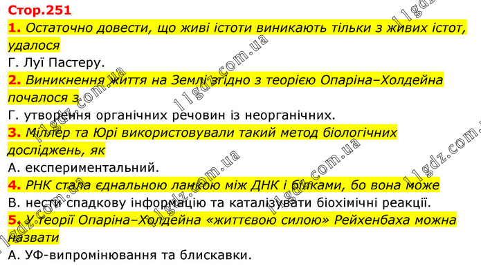 1. Остаточно довести, що живі істоти виникають тільки з живих істот, удалося Г. Луї Пастеру. 2. Виникнення життя на Землі згідно з теорією Опаріна–Холдейна почалося з Г. утворення органічних речовин із неорганічних. 3. Міллер та Юрі використовували такий метод біологічних досліджень, як А. експериментальний. 4. РНК стала єднальною ланкою між ДНК і білками, бо вона може В. нести спадкову інформацію та каталізувати біохімічні реакції. 5. У теорії Опаріна–Холдейна «життєвою силою» Рейхенбаха можна назвати А. УФ-випромінювання та блискавки.