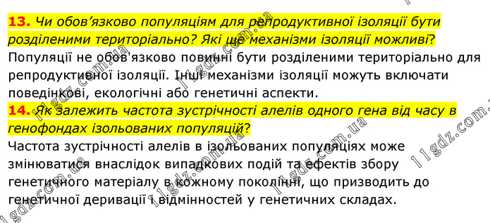 13. Чи обов’язково популяціям для репродуктивної ізоляції бути розділеними територіально? Які ще механізми ізоляції можливі? Популяції не обов'язково повинні бути розділеними територіально для репродуктивної ізоляції. Інші механізми ізоляції можуть включати поведінкові, екологічні або генетичні аспекти. 14. Як залежить частота зустрічності алелів одного гена від часу в генофондах ізольованих популяцій? Частота зустрічності алелів в ізольованих популяціях може змінюватися внаслідок випадкових подій та ефектів збору генетичного матеріалу в кожному поколінні, що призводить до генетичної деривації і відмінностей у генетичних складах.