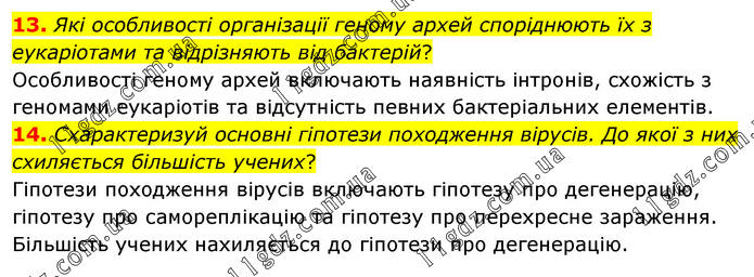 13. Які особливості організації геному архей споріднюють їх з еукаріотами та відрізняють від бактерій? Особливості геному архей включають наявність інтронів, схожість з геномами еукаріотів та відсутність певних бактеріальних елементів. 14. Схарактеризуй основні гіпотези походження вірусів. До якої з них схиляється більшість учених? Гіпотези походження вірусів включають гіпотезу про дегенерацію, гіпотезу про самореплікацію та гіпотезу про перехресне зараження. Більшість учених нахиляється до гіпотези про дегенерацію.