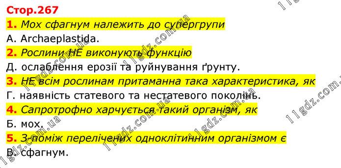1. Мох сфагнум належить до супергрупи А. Archaеplastida. 2. Рослини НЕ виконують функцію Д. ослаблення ерозії та руйнування ґрунту. 3. НЕ всім рослинам притаманна така характеристика, як Г. наявність статевого та нестатевого поколінь. 4. Сапротрофно харчується такий організм, як Б. мох. 5. З-поміж перелічених одноклітинним організмом є В. сфагнум.