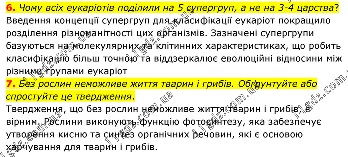 6. Чому всіх еукаріотів поділили на 5 супергруп, а не на 3-4 царства? Введення концепції супергруп для класифікації еукаріот покращило розділення різноманітності цих організмів. Зазначені супергрупи базуються на молекулярних та клітинних характеристиках, що робить класифікацію більш точною та віддзеркалює еволюційні відносини між різними групами еукаріот 7. Без рослин неможливе життя тварин і грибів. Обґрунтуйте або спростуйте це твердження. Твердження, що без рослин неможливе життя тварин і грибів, є вірним. Рослини виконують функцію фотосинтезу, яка забезпечує утворення кисню та синтез органічних речовин, які є основою харчування для тварин і грибів.