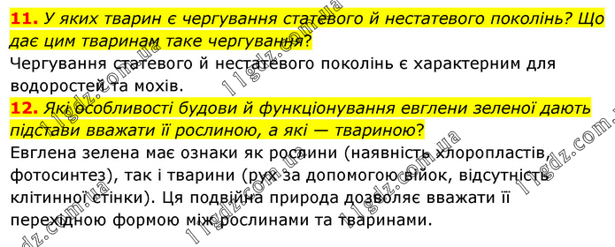 11. У яких тварин є чергування статевого й нестатевого поколінь? Що дає цим тваринам таке чергування? Чергування статевого й нестатевого поколінь є характерним для водоростей та мохів. 12. Які особливості будови й функціонування евглени зеленої дають підстави вважати її рослиною, а які — твариною? Евглена зелена має ознаки як рослини (наявність хлоропластів, фотосинтез), так і тварини (рух за допомогою війок, відсутність клітинної стінки). Ця подвійна природа дозволяє вважати її перехідною формою між рослинами та тваринами.