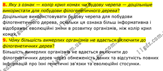 8. Яку з ознак — колір крил комах чи будову черепа — доцільніше використати для побудови філогенетичного дерева? Доцільніше використовувати будову черепа для побудови філогенетичного дерева, оскільки ця ознака більш інформативна і відображає еволюційні зміни в розвитку організмів, ніж колір крил комах. 9. Чому більшість вимерлих організмів не вдається включити до філогенетичних дерев? Більшість вимерлих організмів не вдається включити до філогенетичних дерев через обмеженість даних та відсутність повних інформацій про їхні генетичні зв'язки та еволюційні стосунки.