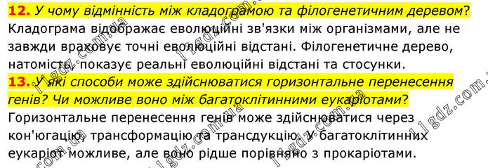12. У чому відмінність між кладограмою та філогенетичним деревом? Кладограма відображає еволюційні зв'язки між організмами, але не завжди враховує точні еволюційні відстані. Філогенетичне дерево, натомість, показує реальні еволюційні відстані та стосунки. 13. У які способи може здійснюватися горизонтальне перенесення генів? Чи можливе воно між багатоклітинними еукаріотами? Горизонтальне перенесення генів може здійснюватися через кон'югацію, трансформацію та трансдукцію. У багатоклітинних еукаріот можливе, але воно рідше порівняно з прокаріотами.
