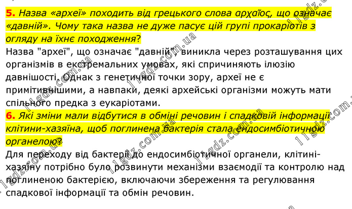 5. Назва «археї» походить від грецького слова αρχαῖος, що означає «давній». Чому така назва не дуже пасує цій групі прокаріотів з огляду на їхнє походження? Назва "археї", що означає "давній", виникла через розташування цих організмів в екстремальних умовах, які спричиняють ілюзію давнішості. Однак з генетичної точки зору, археї не є примітивнішими, а навпаки, деякі архейські організми можуть мати спільного предка з еукаріотами. 6. Які зміни мали відбутися в обміні речовин і спадковій інформації клітини-хазяїна, щоб поглинена бактерія стала ендосимбіотичною органелою? Для переходу від бактерії до ендосимбіотичної органели, клітині-хазяїну потрібно було розвинути механізми взаємодії та контролю над поглиненою бактерією, включаючи збереження та регулювання спадкової інформації та обмін речовин.