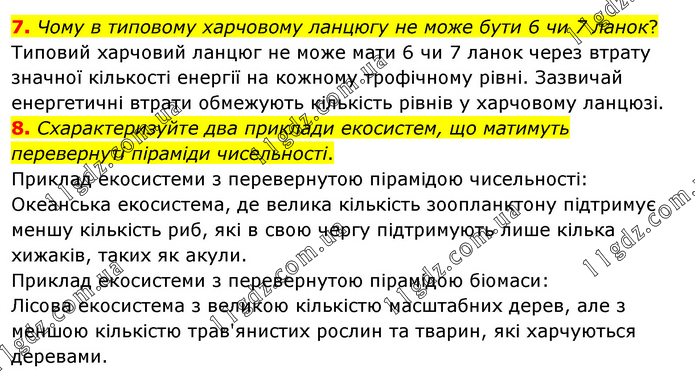 7. Чому в типовому харчовому ланцюгу не може бути 6 чи 7 ланок? Типовий харчовий ланцюг не може мати 6 чи 7 ланок через втрату значної кількості енергії на кожному трофічному рівні. Зазвичай енергетичні втрати обмежують кількість рівнів у харчовому ланцюзі. 8. Схарактеризуйте два приклади екосистем, що матимуть перевернуті піраміди чисельності. Приклад екосистеми з перевернутою пірамідою чисельності: Океанська екосистема, де велика кількість зоопланктону підтримує меншу кількість риб, які в свою чергу підтримують лише кілька хижаків, таких як акули. Приклад екосистеми з перевернутою пірамідою біомаси: Лісова екосистема з великою кількістю масштабних дерев, але з меншою кількістю трав'янистих рослин та тварин, які харчуються деревами.