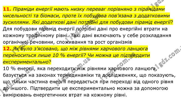 11. Піраміди енергії мають низку переваг порівняно з пірамідами чисельності та біомаси, проте їх побудова пов’язана з додатковими зусиллями. Які додаткові дані потрібні для побудови пірамід енергії? Для побудови пірамід енергії потрібні дані про енергійні втрати на кожному трофічному рівні. Такі дані включають у себе розкладання органічної речовини, споживання та рост організмів 12. Як було з’ясовано, що між рівнями харчового ланцюга переноситься лише 10 % енергії? Чи можна це підтвердити експериментально? 10 % енергії, яка переходить між рівнями харчового ланцюга, базується на законах термодинаміки та дослідженнях, що показують, що тільки частина енергії передається при переході від одного рівня до іншого. Підтвердити це експериментально можна за допомогою вимірювань енергетичних втрат на кожному рівні.