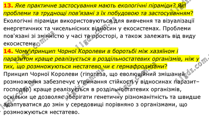 13. Яке практичне застосування мають екологічні піраміди? Які проблеми та труднощі пов’язані з їх побудовою та застосуванням? Екологічні піраміди використовуються для вивчення та візуалізації енергетичних та чисельнісних відносин у екосистемах. Проблеми пов'язані зі змінністю у часі та просторі, а також залежать від виду екосистеми. 14. Чому принцип Чорної Королеви в боротьбі між хазяїном і паразитом краще реалізується в роздільностатевих організмів, ніж у тих, що розмножуються нестатево чи є гермафродитами? Принцип Чорної Королеви (гіпотеза, що еволюційний змішаний розмноження забезпечує утримання стійкості у відносинах паразит–господар) краще реалізується в роздільностатевих організмів, оскільки це дозволяє зберігати генетичну різноманітність та швидше адаптуватися до змін у середовищі порівняно з організмами, що розмножуються нестатево.