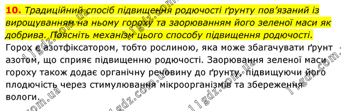 Традиційний спосіб підвищення родючості ґрунту пов’язаний із вирощуванням на ньому гороху та заорюванням його зеленої маси як добрива. Поясніть механізм цього способу підвищення родючості. Горох є азотфіксатором, тобто рослиною, яка може збагачувати ґрунт азотом, що сприяє підвищенню родючості. Заорювання зеленої маси гороху також додає органічну речовину до ґрунту, підвищуючи його плодючість через стимулювання мікроорганізмів та збереження вологи.