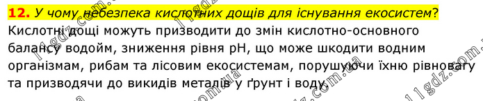 У чому небезпека кислотних дощів для існування екосистем? Кислотні дощі можуть призводити до змін кислотно-основного балансу водойм, зниження рівня pH, що може шкодити водним організмам, рибам та лісовим екосистемам, порушуючи їхню рівновагу та призводячи до викидів металів у ґрунт і воду.