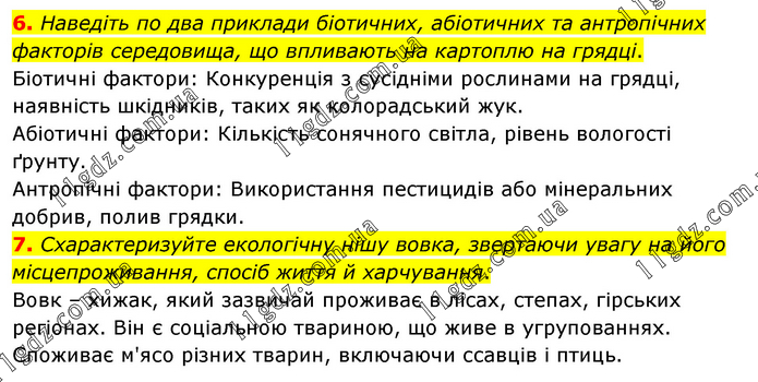 6. Наведіть по два приклади біотичних, абіотичних та антропічних факторів середовища, що впливають на картоплю на грядці. Біотичні фактори: Конкуренція з сусідніми рослинами на грядці, наявність шкідників, таких як колорадський жук. Абіотичні фактори: Кількість сонячного світла, рівень вологості ґрунту. Антропічні фактори: Використання пестицидів або мінеральних добрив, полив грядки. 7. Схарактеризуйте екологічну нішу вовка, звертаючи увагу на його місцепроживання, спосіб життя й харчування. Вовк – хижак, який зазвичай проживає в лісах, степах, гірських регіонах. Він є соціальною твариною, що живе в угрупованнях. Споживає м'ясо різних тварин, включаючи ссавців і птиць.