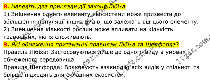 8. Наведіть два приклади дії закону Лібіха 1) Зміцнення одного елементу екосистеми може призвести до збільшення популяції інших видів, що залежать від цього елементу. 2) Зменшення кількості рослин може впливати на кількість травоїдних, які їх споживають. 9. Які обмеження притаманні правилам Лібіха та Шелфорда? Правила Лібіха: Застосовуються лише до одного виду в умовах обмеженого середовища. Правила Шелфорда: Враховують взаємодію всіх видів у спільноті та більше підходять для складних екосистем.
