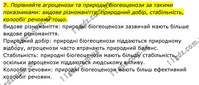 Порівняйте агроценози та природні біогеоценози за такими показниками: видове різноманіття, природний добір, стабільність, колообіг речовин тощо. Видове різноманіття: природні біогеоценози зазвичай мають більше видове різноманіття. Природний добір: природні біогеоценози піддаються природному відбору, агроценози часто втрачають природний баланс. Стабільність: природні біогеоценози мають більшу стабільність, оскільки агроценози піддаються людському впливу. Колообіг речовин: природні біогеоценози мають більш ефективний колообіг речовин.