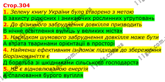 1. Зелену книгу України було створено з метою В захисту рідкісних і зникаючих рослинних угруповань 2. До фізичного забруднення довкілля призводить В нічне освітлення вулиць у великих містах 3. Наслідком шумового забруднення довкілля може бути А втрата тваринами орієнтації в просторі 4. Найменш ефективним із-поміж підходів до збереження біорізноманіття є Д боротьба зі шкідниками сільського господарста 5. НЕ є відновлюваною енергія А спалювання бурого вугілля