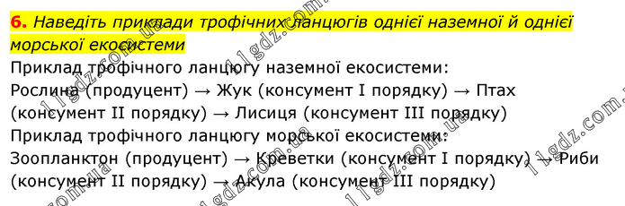 Наведіть приклади трофічних ланцюгів однієї наземної й однієї морської екосистеми Приклад трофічного ланцюгу наземної екосистеми: Рослина (продуцент) → Жук (консумент I порядку) → Птах (консумент II порядку) → Лисиця (консумент III порядку) Приклад трофічного ланцюгу морської екосистеми: Зоопланктон (продуцент) → Креветки (консумент I порядку) → Риби (консумент II порядку) → Акула (консумент III порядку)