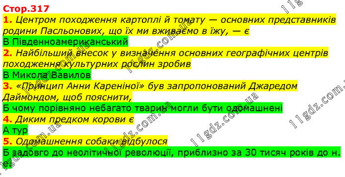 1. Центром походження картоплі й томату — основних представників родини Пасльонових, що їх ми вживаємо в їжу, — є В Південноамериканський 2. Найбільший внесок у визначення основних географічних центрів походження культурних рослин зробив В Микола Вавилов 3. «Принцип Анни Кареніної» був запропонований Джаредом Даймондом, щоб пояснити, Б чому порівняно небагато тварин могли бути одомашнені 4. Диким предком корови є А тур 5. Одомашнення собаки відбулося Б задовго до неолітичної революції, приблизно за 30 тисяч років до н. е.