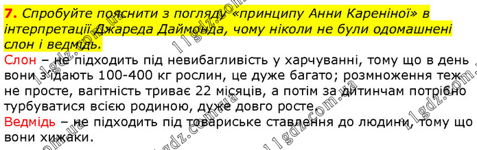Спробуйте пояснити з погляду «принципу Анни Кареніної» в інтерпретації Джареда Даймонда, чому ніколи не були одомашнені слон і ведмідь. Слон – не підходить під невибагливість у харчуванні, тому що в день вони з’їдають 100-400 кг рослин, це дуже багато; розмноження теж не просте, вагітність триває 22 місяців, а потім за дитинчам потрібно турбуватися всією родиною, дуже довго росте. Ведмідь – не підходить під товариське ставлення до людини, тому що вони хижаки.