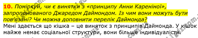 Поміркуй, чи є винятки з «принципу Анни Кареніної», запропонованого Джаредом Даймондом. Із чим вони можуть бути пов’язані? Чи можна доповнити перелік Даймонда? Мені здається що кішка – це виняток з принципів Даймонда. У кішок майже немає соціальної структури, вони більше індивідуалісти.
