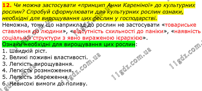 Чи можна застосувати «принцип Анни Кареніної» до культурних рослин? Спробуй сформулювати для культурних рослин ознаки, необхідні для вирощування цих рослин у господарстві. Неможна, тому що наприклад до рослин не застосувати «товариське ставлення до людини», «відсутність схильності до паніки», «наявність соціальної структури з явно вираженою ієрархією». Ознаки необхідні для вирощування цих рослин: 1. Швидкій ріст. 2. Великі поживні властивості. 3. Легкість вирощування. 4. Легкість розмноження. 5. Легкість збереження. 6. Невисокі вимоги до поливу.